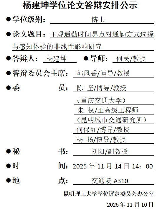 杨建坤学位论文答辩安排公示